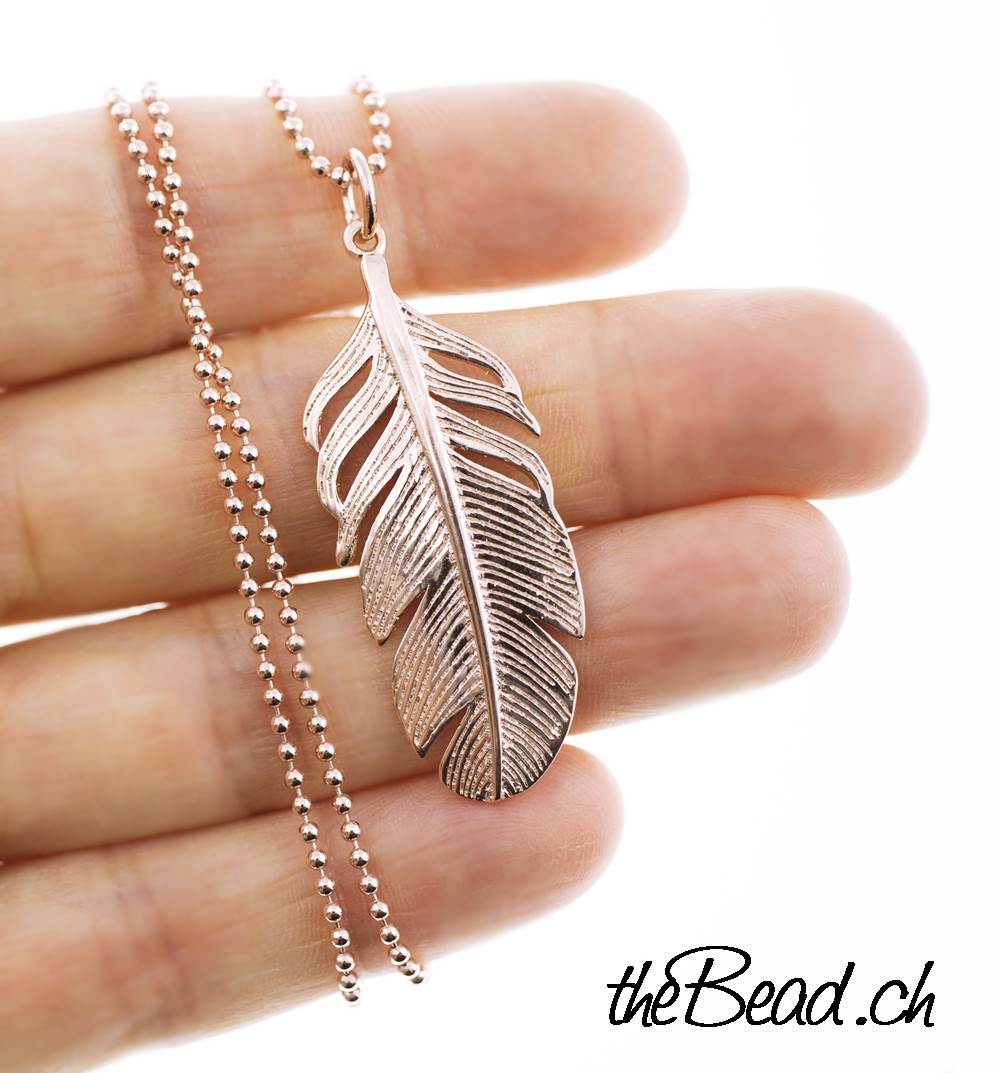 Liebevoll verarbeiteter, 925 Sterling Silber rosevergoldeter FEDER Anhänger, die Halskette ist ebenfalls im Gesamtbetrag enthalten, Kettenlänge ist wählbar.