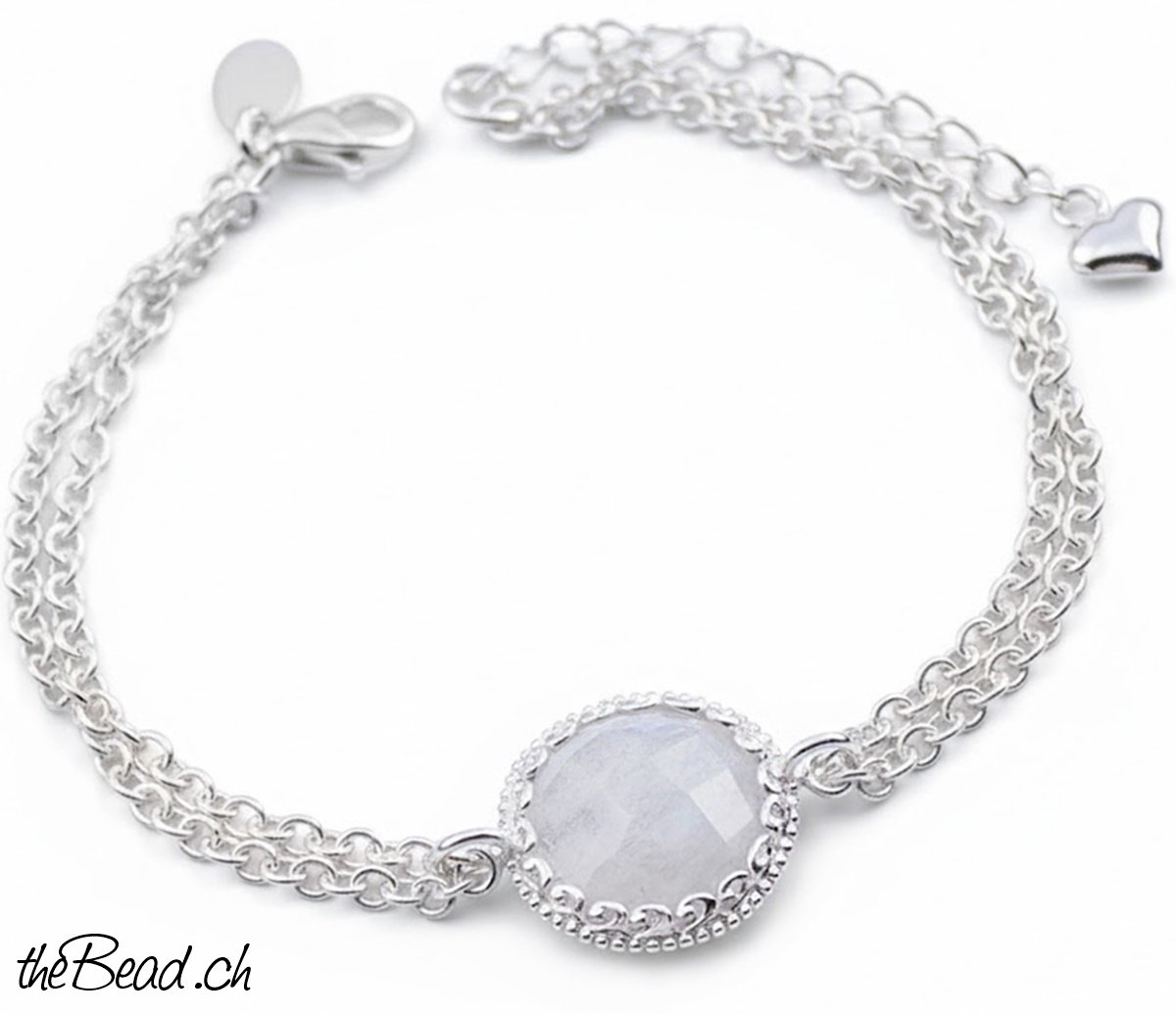 Der Regenbogen Mondstein ist wunderschön romantisch eingefasst.