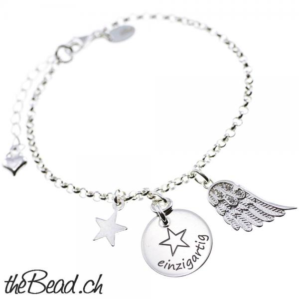 Silberarmband mit FLÜGEL & STERN & GRAVUR Anhänger