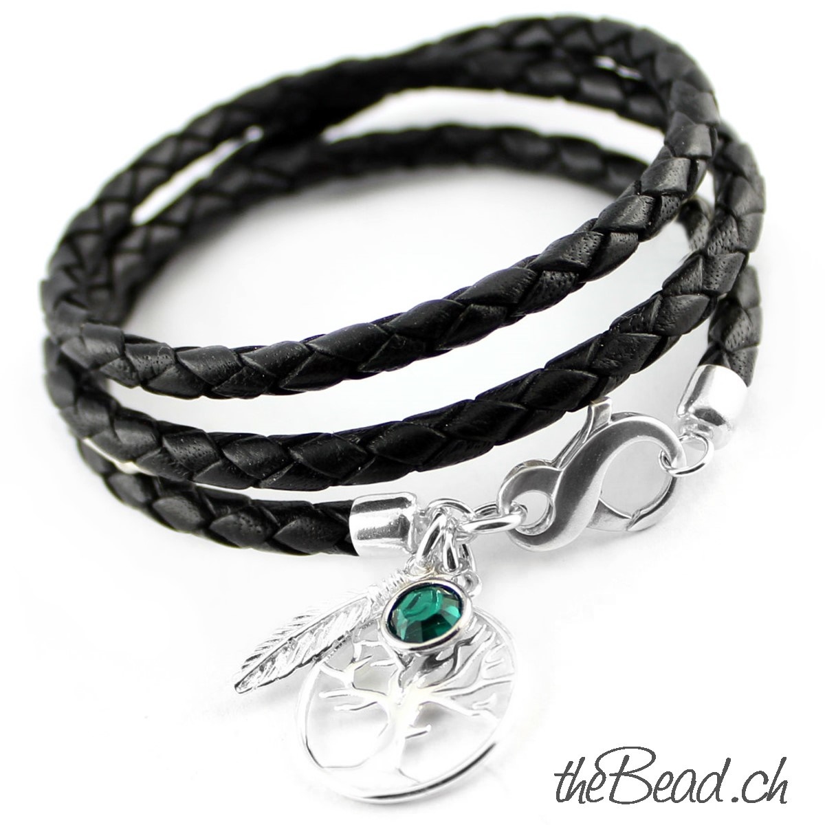 Trendiges Wickelarmband mit grossem Schmuckkarabiner - Verschluss Das Armband besteht aus geflochtenem Leder und drei Anhängern - einer FEDER, einem LEBENSBAUM und einem KRISTALL Anhänger.