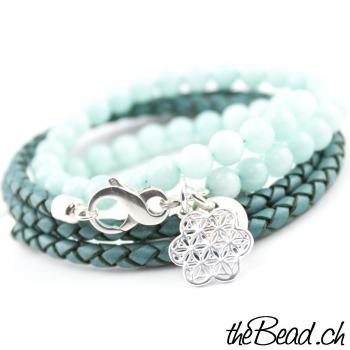 Tolles Damen Wickelarmband mit BLUME des LEBENS Anhänger. Das Armband besteht aus echten Amazonit Perlen und geflochtenem Leder. Alles passt wunderbar zusammen.