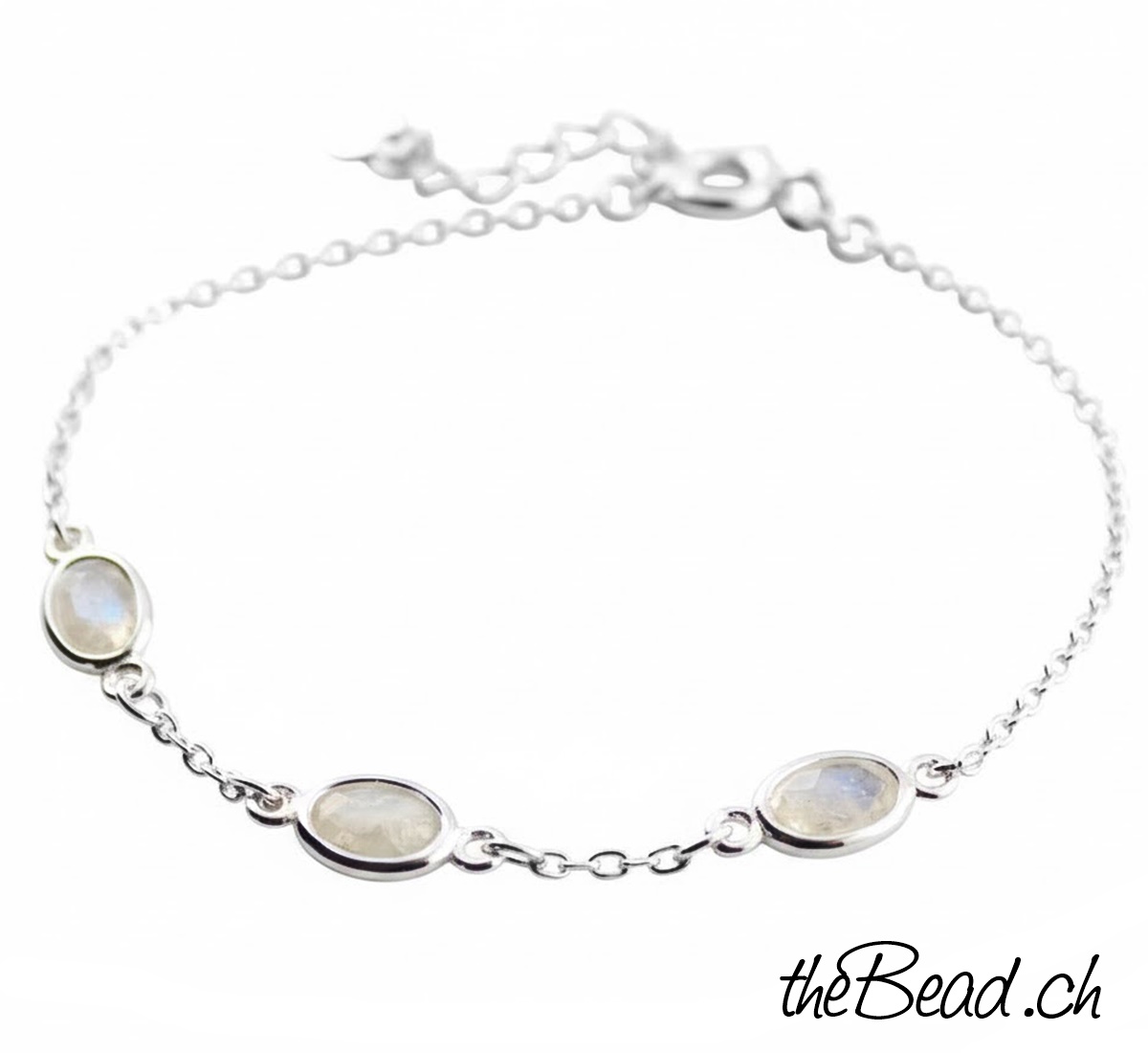 Das Armband ist in Silber gearbeitet und mit drei eingefassten Regenbogenmondsteinen verziert.