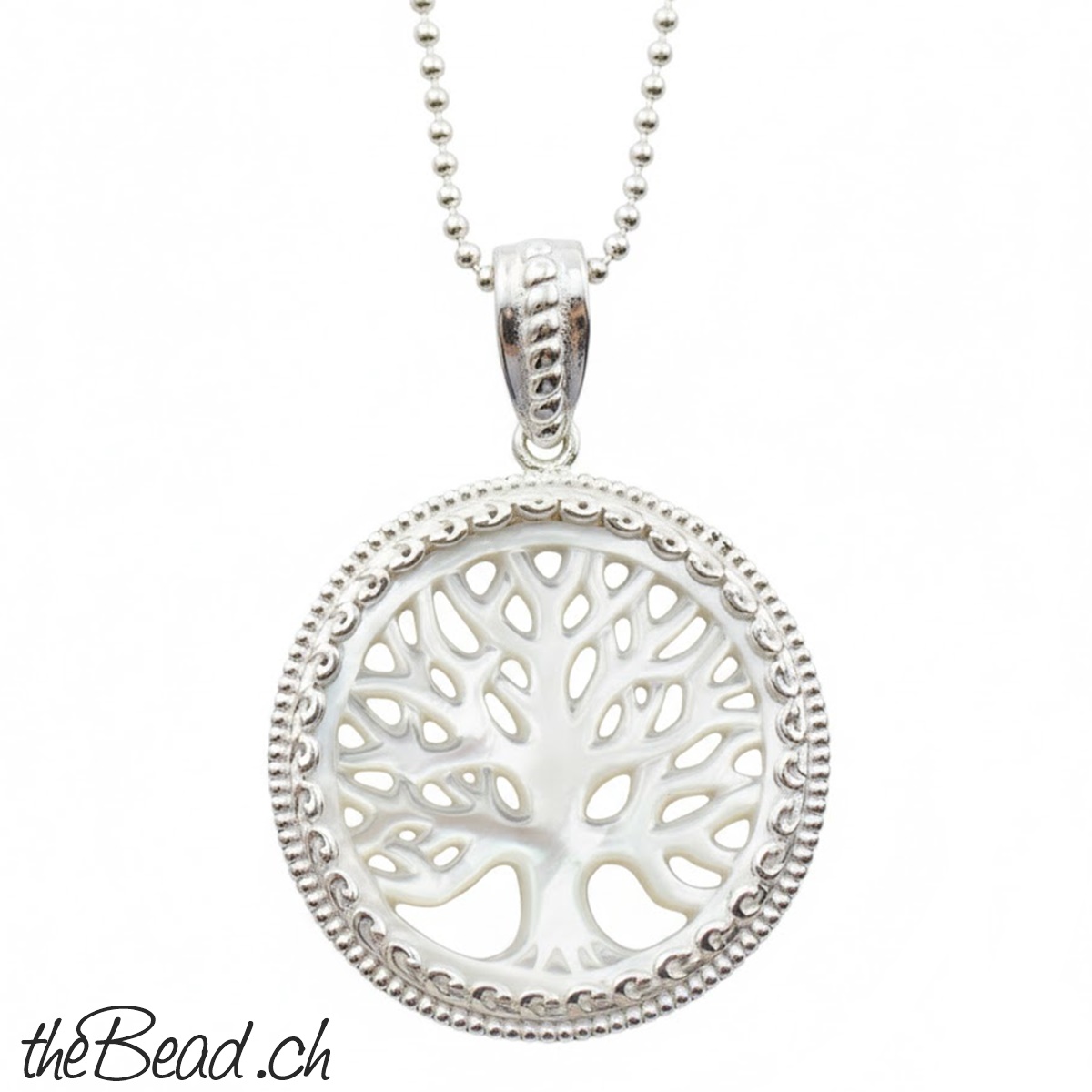Dieses Silbercollier besteht aus einem in Silber eingefassten " Lebensbaum " aus Perlmutt, der Anhänger kommt mit einer Silberhalskette ( Länge wählbar ) zu Ihnen nach Hause.