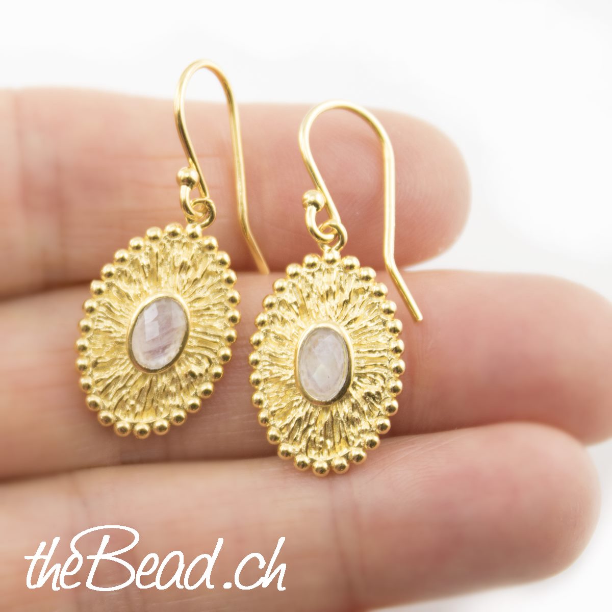 Die Ohrringe bestehen aus vergoldetem Silber, in der Mitte der ovalen Ohrringe sind Regenbogen Mondsteine eingefasst