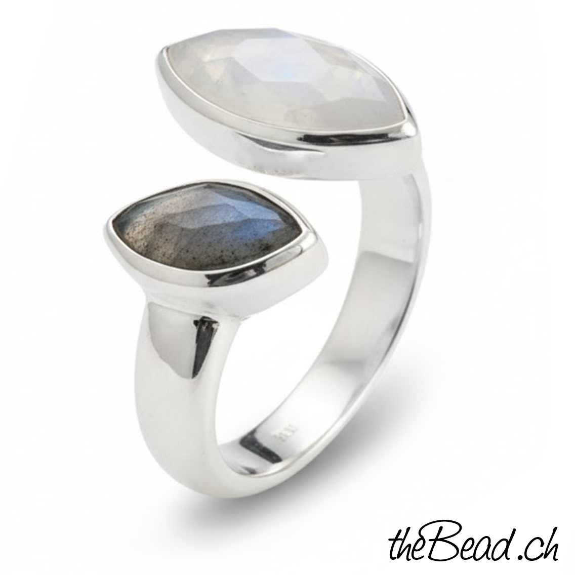 Dieser Fingerring besteht aus einem Regenbogen Mondstein und einem kleineren Labradorit, beide schön geschliffen und ein echter Hinkucker !