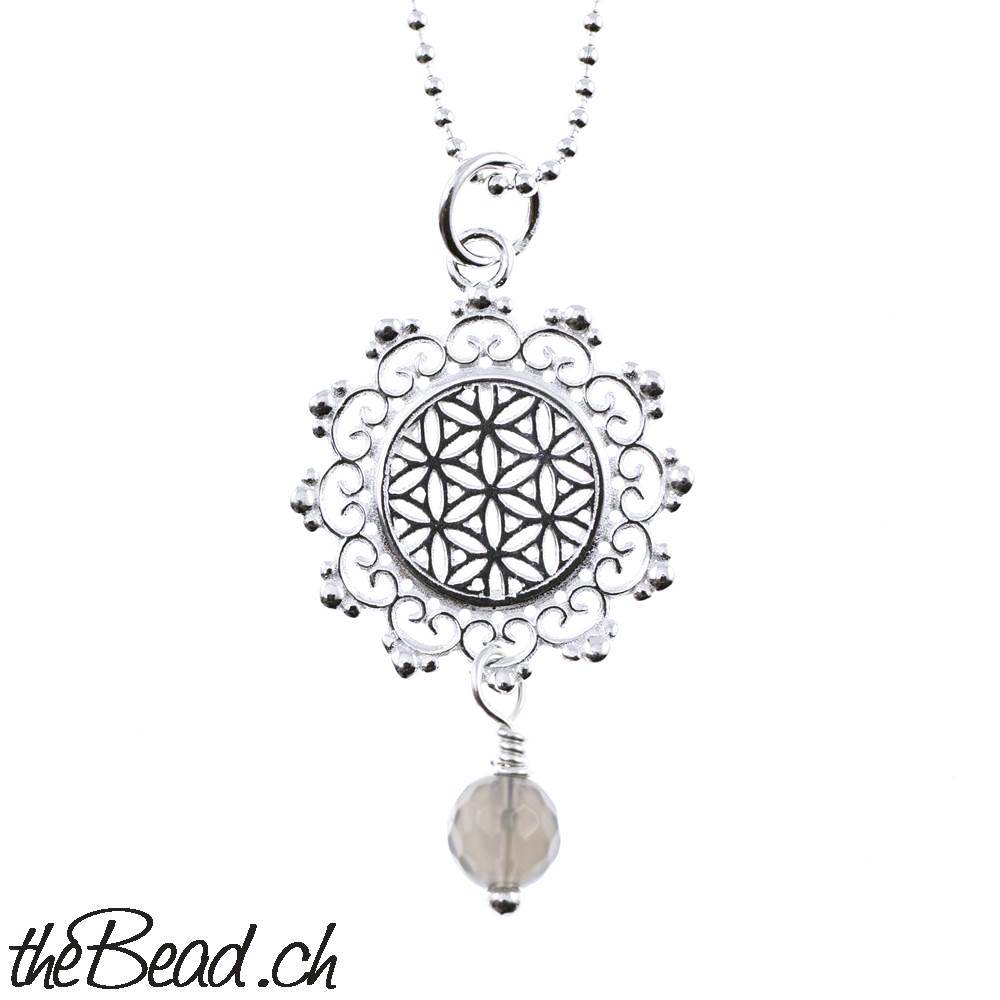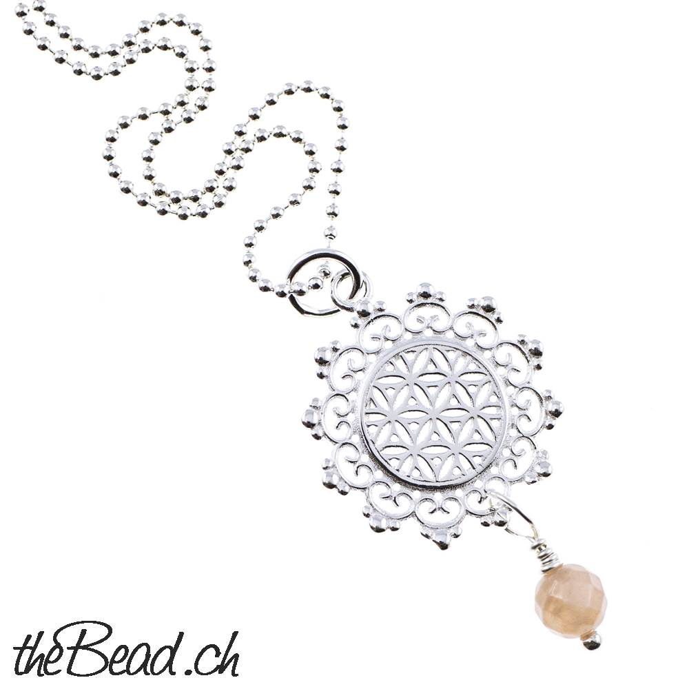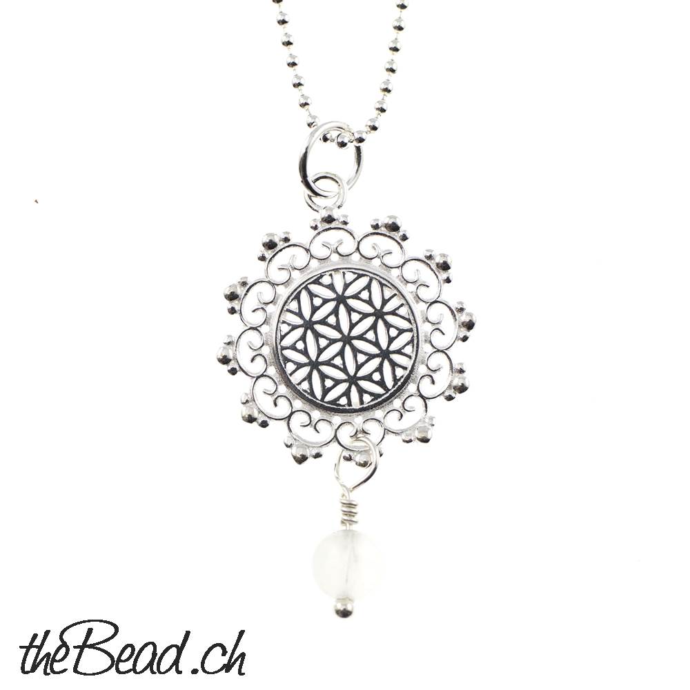 Sehr schöner Silberschmuck, wunderbar gearbeitet und ganz was spezielles, an der BLUME DES LEBENS baumelt eine facettierte AMAZONIT Perle (auch mit Mondstein oder Achat Anhänger wählbar)