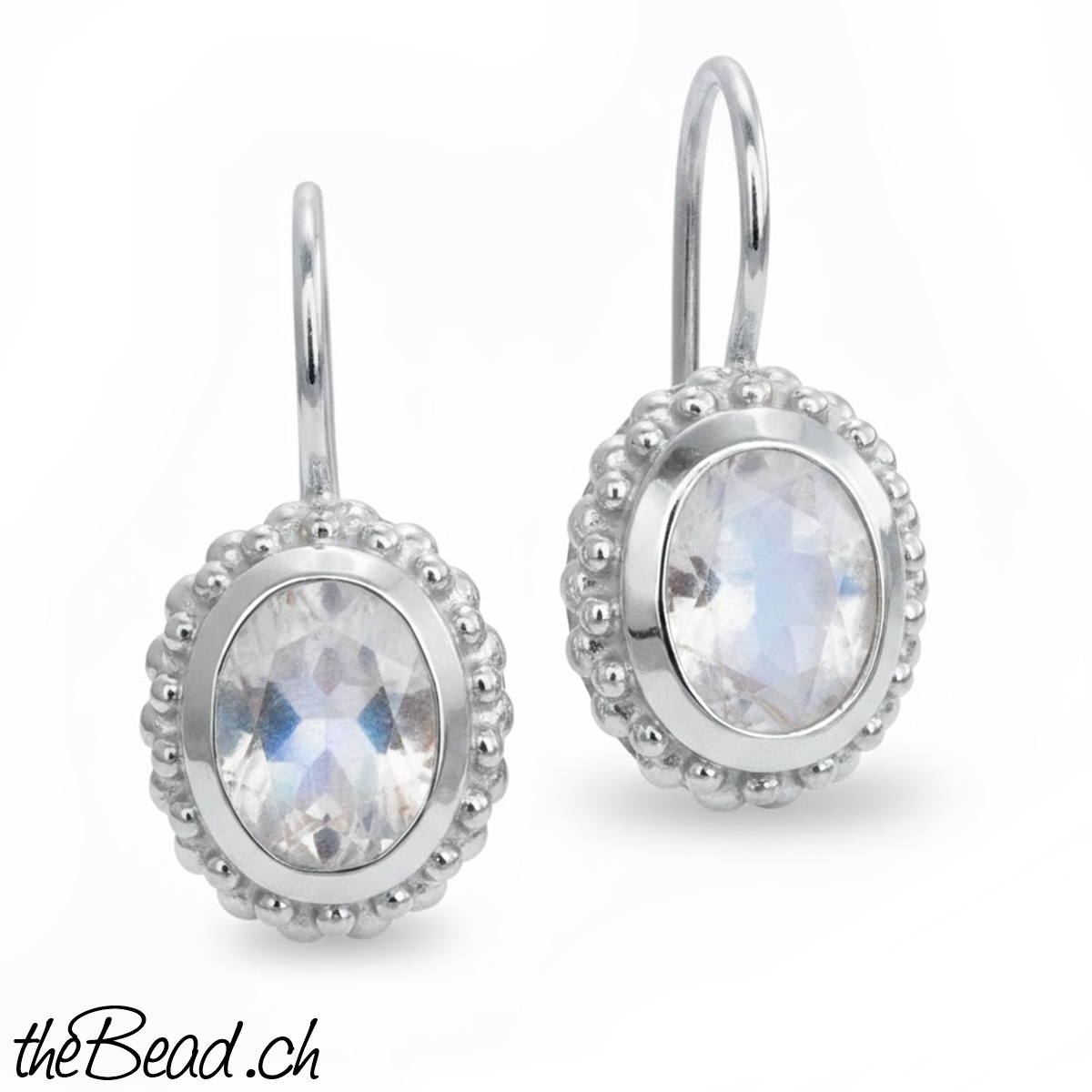 Die Ohrringe bestehen aus geschliffenem Regenbogen Mondsteinen die sehr schön in Silber eingefasst sind.