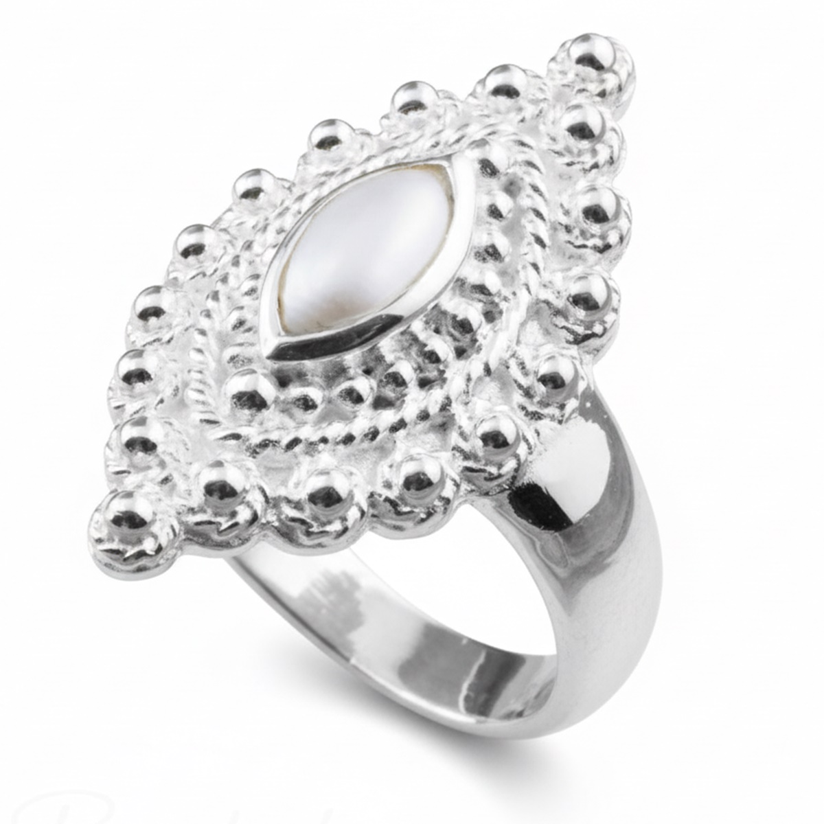 Der Ring ist massiv aus Silber gearbeitet, in der Mitte der Ringschiene sitzt eine Perle.