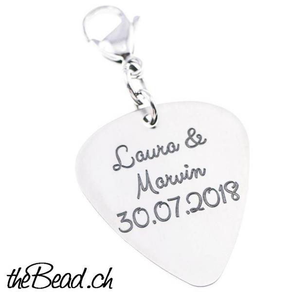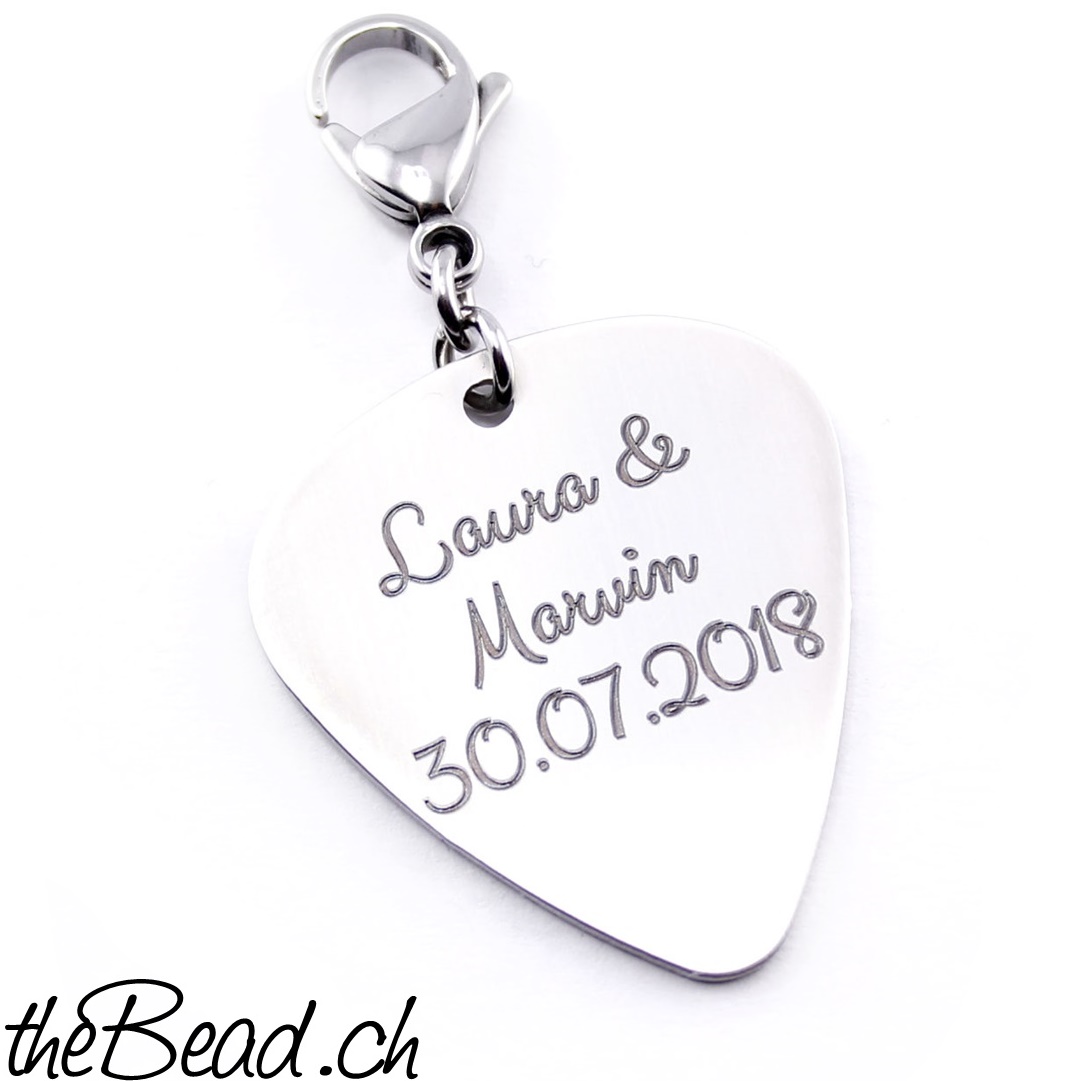 Das Plektrum ist ca. 2,6 x 3 cm gross und aus Edelstahl gefertigt.