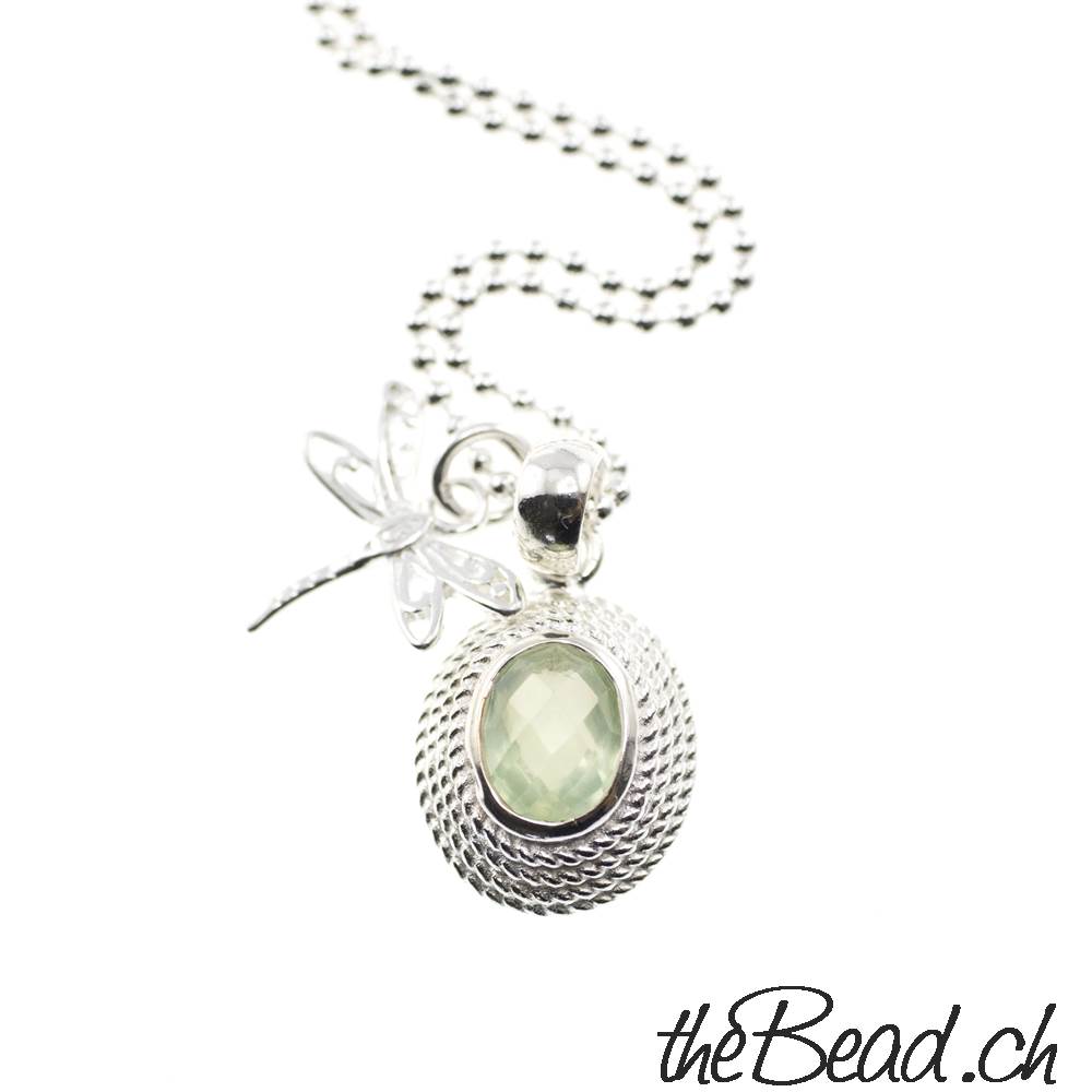 In diesem Schmuckset ist der Prehnit Anhänger, eine süsser kleiner Libellen Anhänger und natürlich auch die Silberhalskette enthalten.