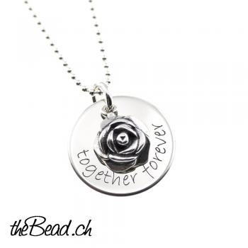 hübsches Silbercollier mit Gravur- und einer Silber Rose, alles aus Echtsilber
