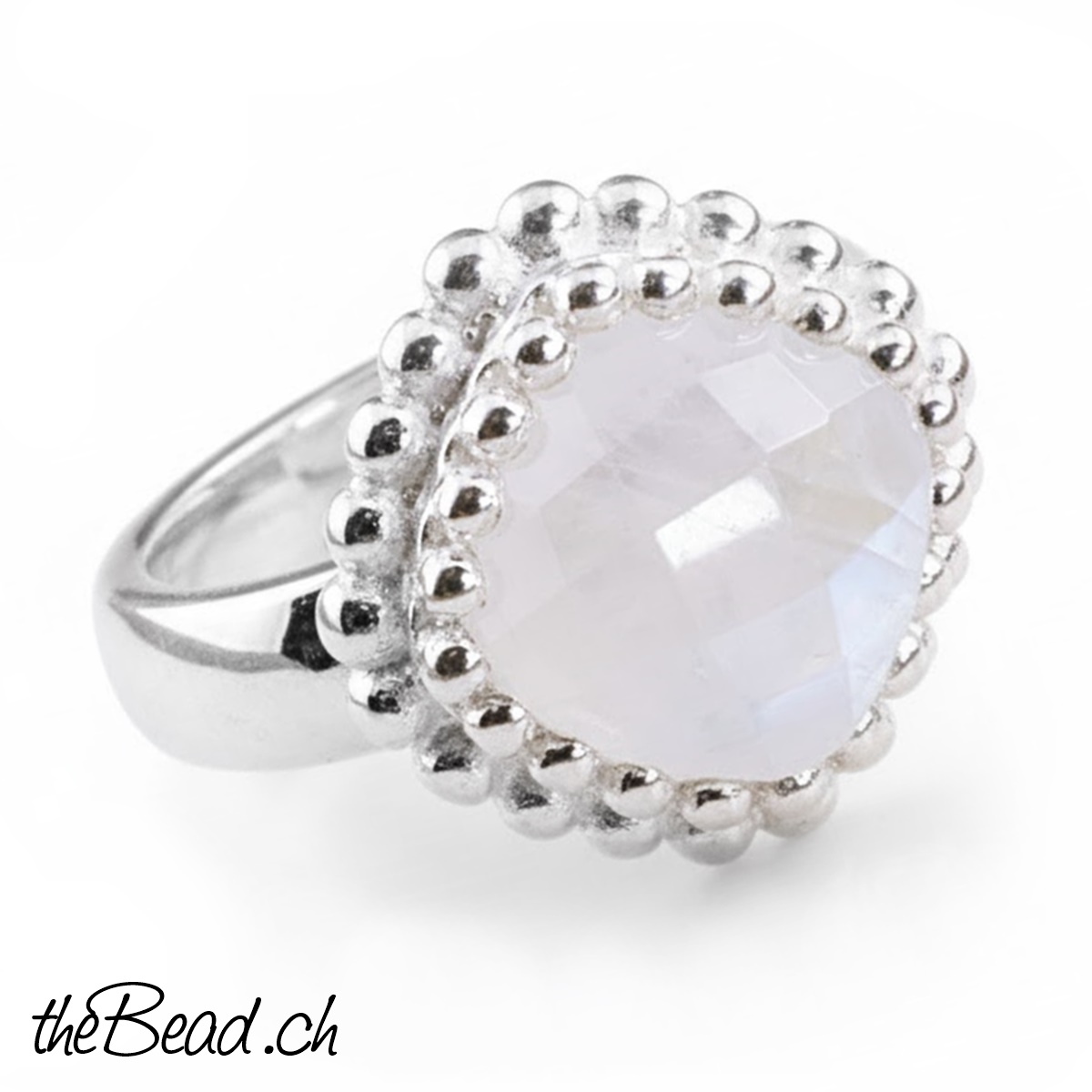 Schöner Silber Fingerring mit geschliffenem Regenbogen Mondstein in Echtsilber