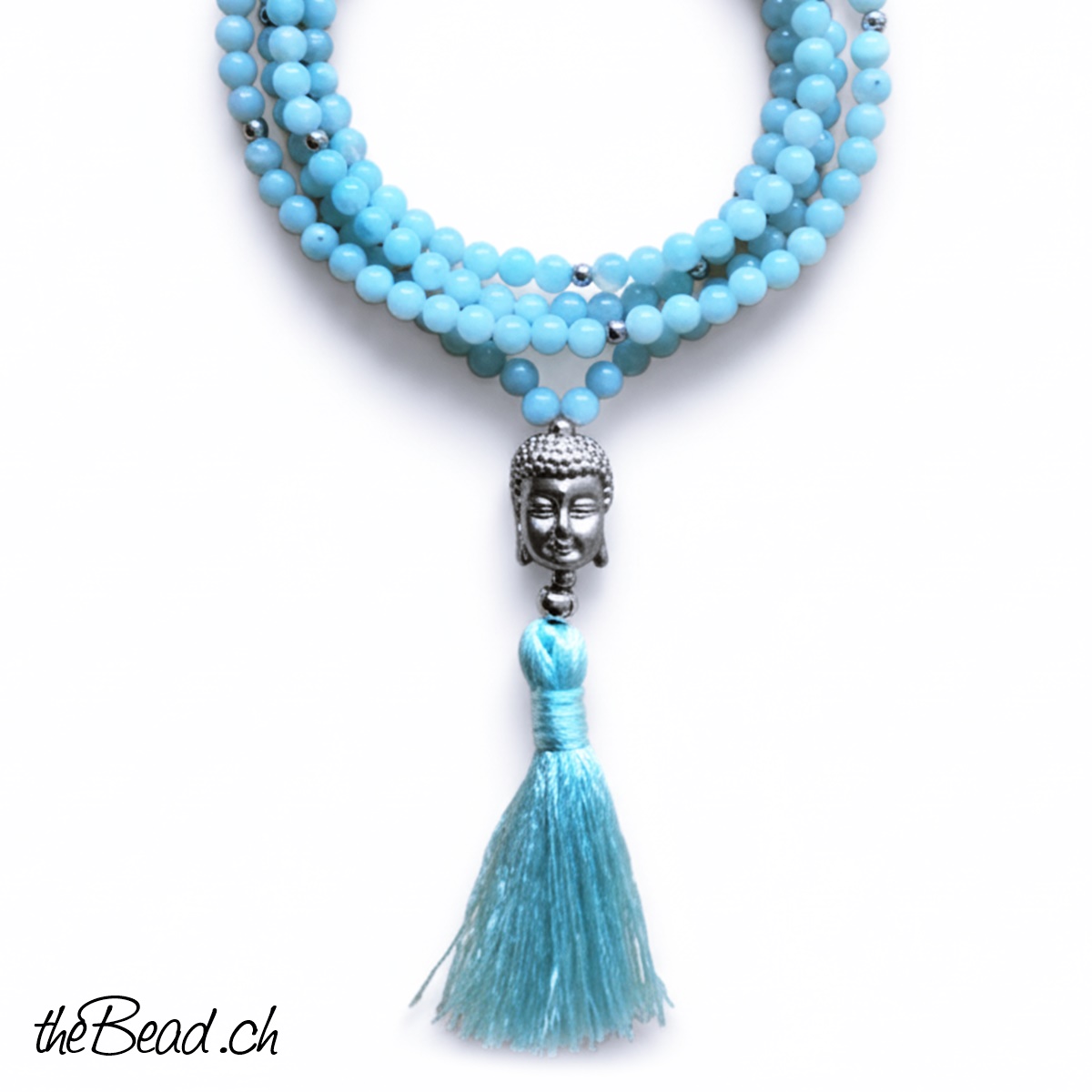 Die Amazonit Halskette ist gesamt 80 cm lang, Perlen ca. 4 mm im Durchm., der Buddha Anhänger mit Quaste ist ca. 7 cm lang