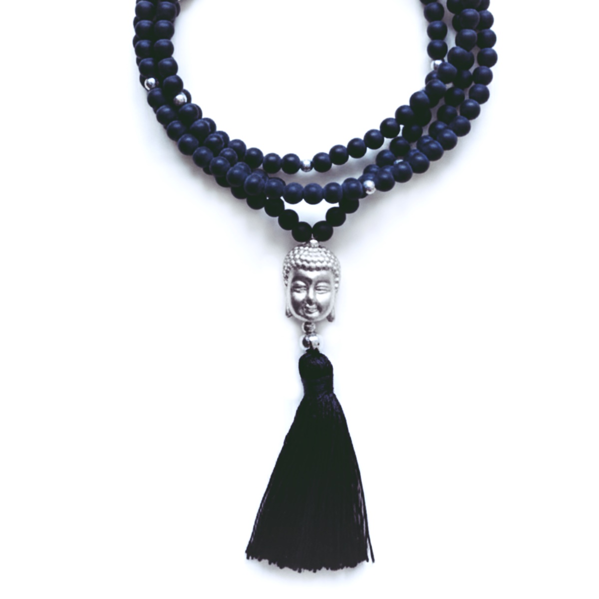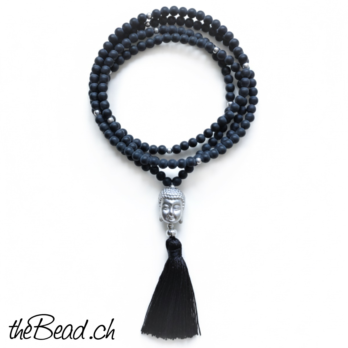 Diese Steinkette besteht aus echten schwarzen, matten Onyx Steinen die mit Silberperlen aufgefädelt sind, dazu ein BUDDHA ( auch Echtsilber ) mit passendem Quasten Anhänger