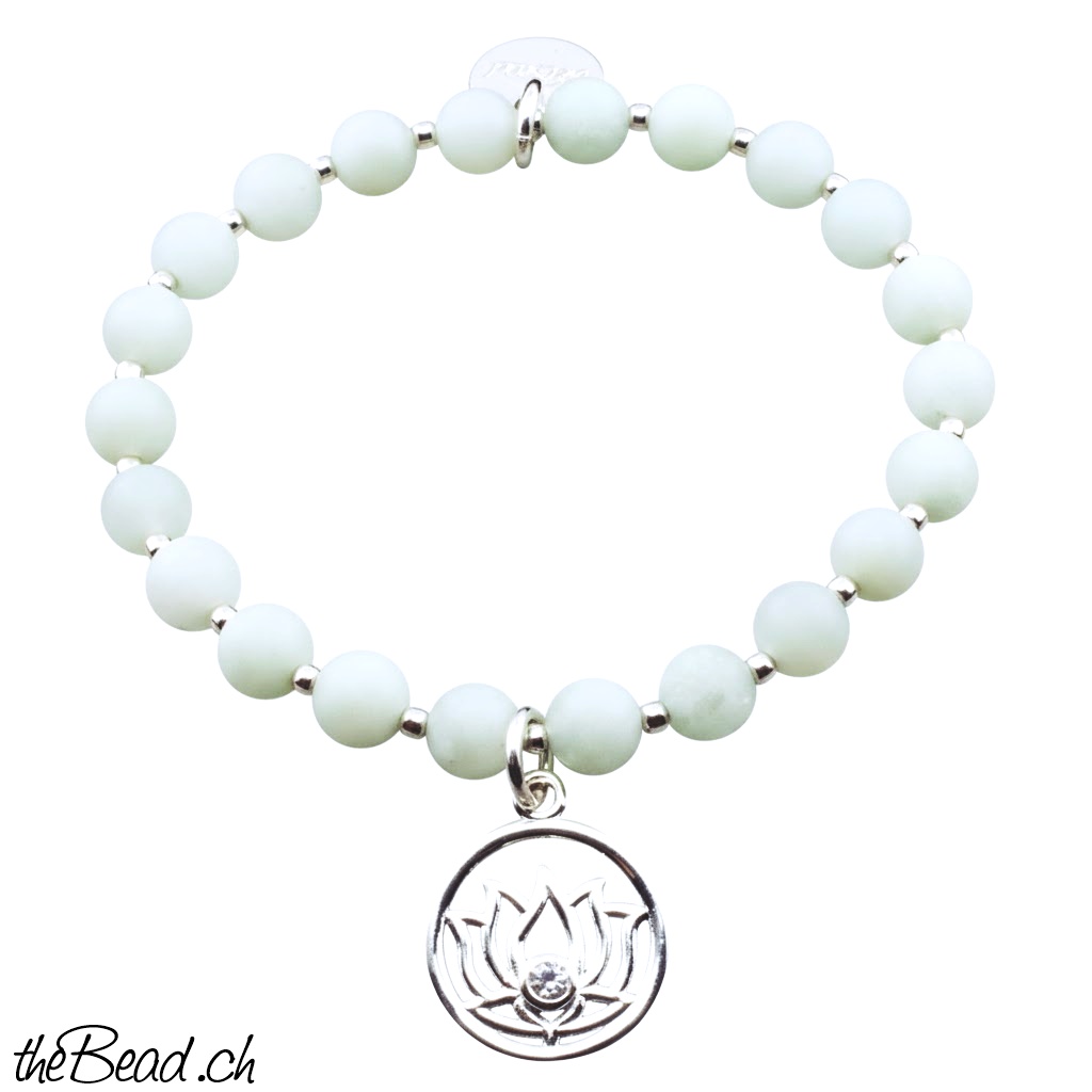 Dieses Armband besteht aus matten Amazonit Perlen und kleinen Silberperlen, der Lotusblüten Anhänger ist ebenfalls aus Silber, in der Mitte ist er mit einem Zirkon verziert.