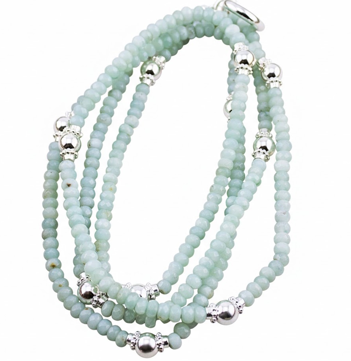 Sehr schöne Perlenkette aus facettierten Amazonit Perlen 4.5 mm, verziert mit vielen Silberperlen.