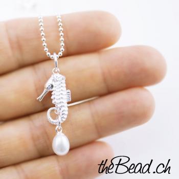Der Seepferdchen Anhänger ist von beiden Seiten gleich schön und aus Echtsilber gearbeitet, ebenso wie die Silber Halskette die ebenfalls zum Schmuckset gehört. An dem kleinen Seepferdchen baumelt eine echte Perle