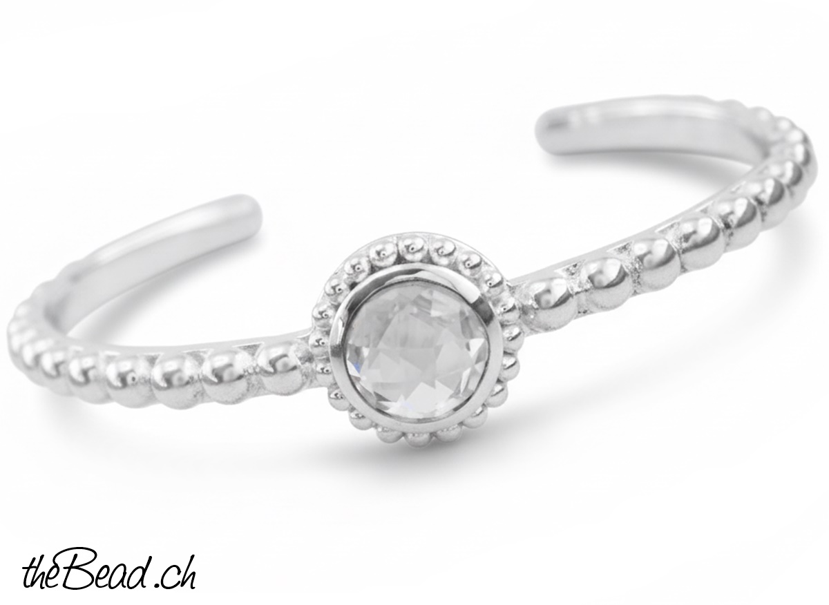 Dieser Armreif ist wunderbar hochwertig aus massivem Silber verarbeitet, in der Mitte sitzt ein geschliffener Bergkristall. Durch den Schliff funkelt er wunderbar im Licht.