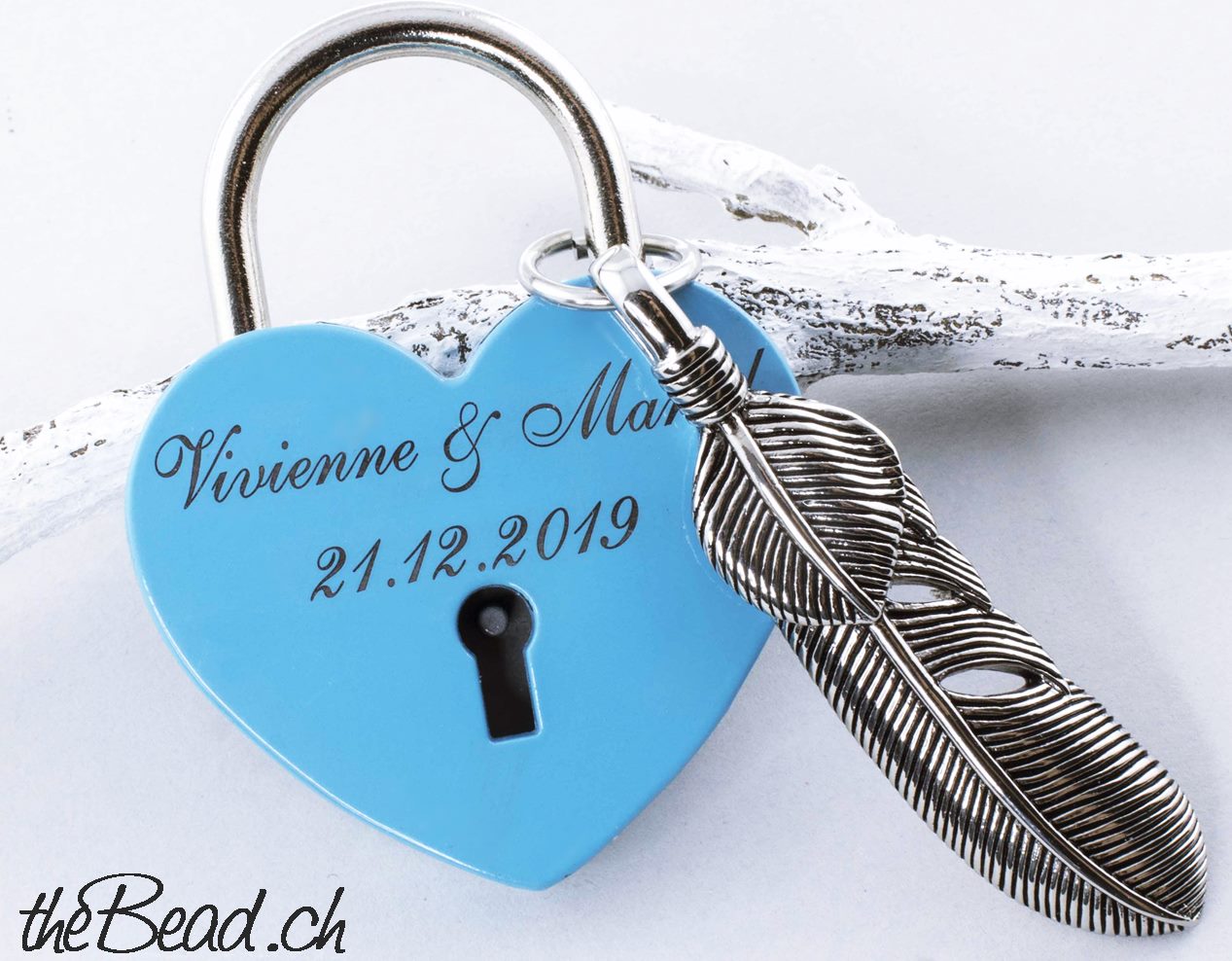 Liebes - Schloss * Herz * in Hellblau mit Ihrer Wunschgravur
