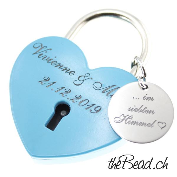 Liebes-Schloss "Herz" in Hellblau mit Ihrer Wunschgravur