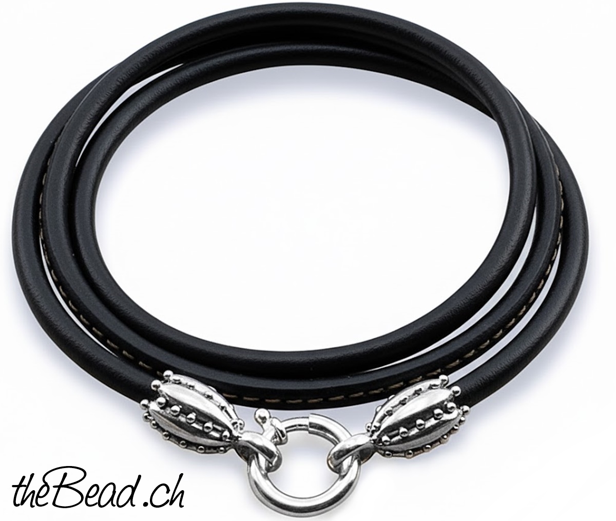 Lederkette mit aussergewöhnlichem Silberverschluss, in den grossen Verschlussring kann ein Anhänger oder auch eine Brille eingehängt werden. Die Lederfarbe ist wählbar, ebenso die Kettenlänge