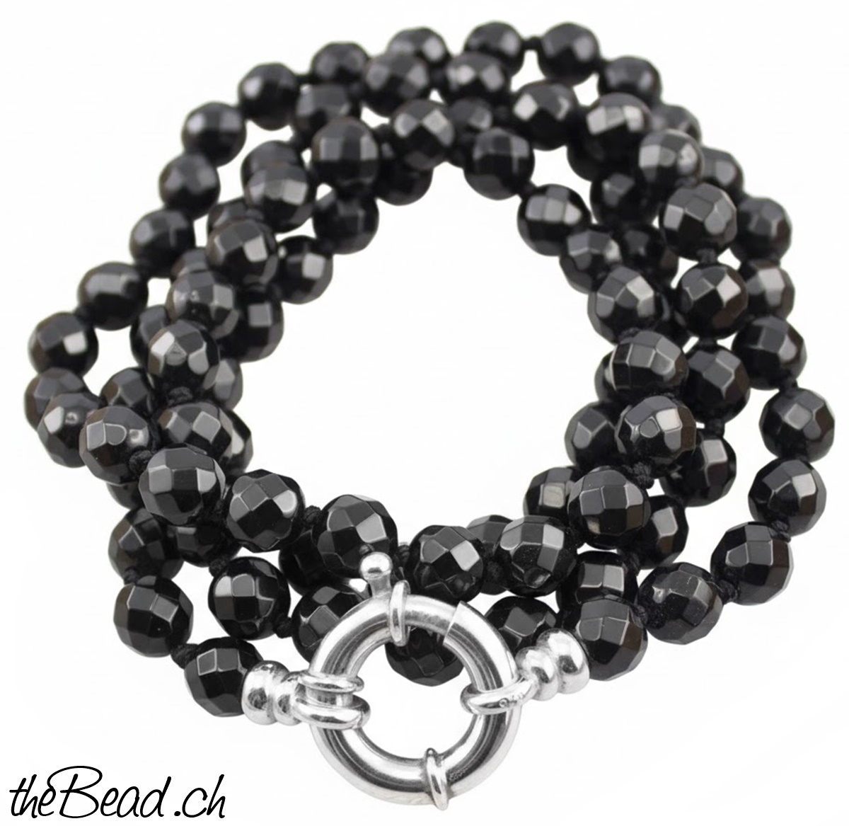 Jede Onyx Perle ist einzeln verknotet, der Schmuckverschluss ist in Echtsilber gearbeitet. Der grosse Schmuckverschluss ist auch perfekt geeignet um einen Anhänger einzuhängen.
