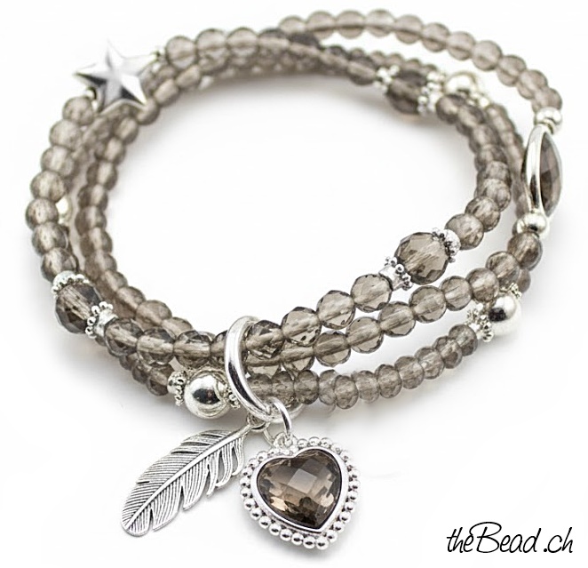 Am Armband baumelt ein Rauchquarz Herzchen und eine Silberfeder Die Rauchquarz- und Silberperlen sind auf ein elastisches Band aufgezogen, daher sehr angenehm zu tragen.