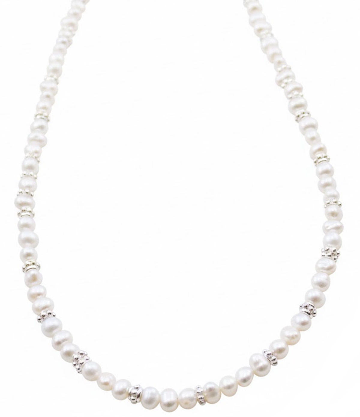 Sehr schöne Perlenkette aus Süsswasserperlen, verziert mit vielen Silberperlen.