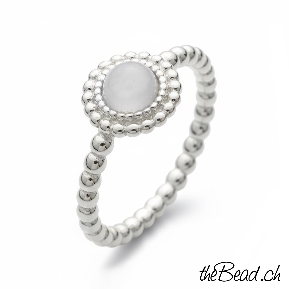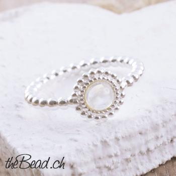 Der Ring ist komplett aus Silber gearbeitet, in der Mitte der Ringschiene sitzt ein kleiner Regenbogen Mondstein