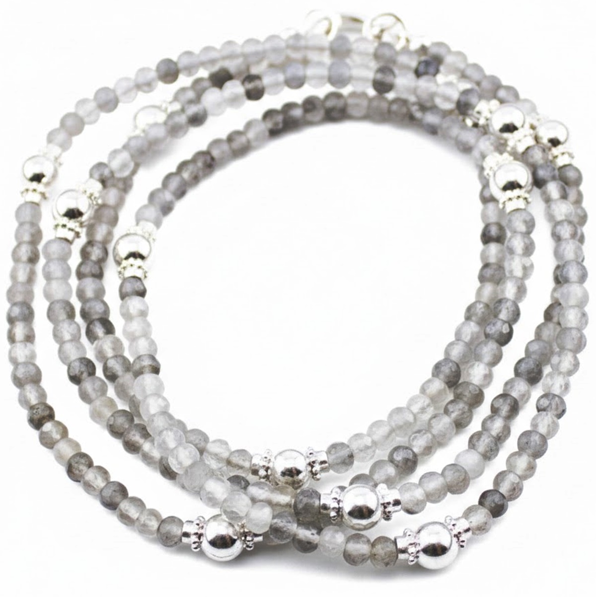 Sehr schöne Perlenkette aus facettierten Silberquarz Perlen ca. 4 mm, verziert mit vielen Silberperlen.