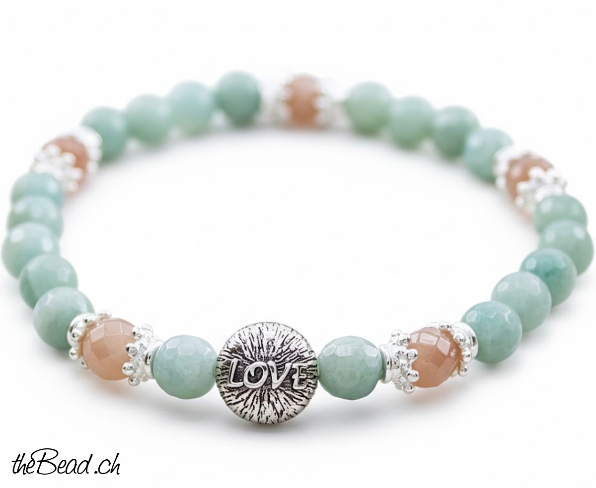 Das Armband besteht aus Amazonit & orangen Mondstein Kugeln sowie vielen Silberelementen die auf ein elastisches Band aufgezogen sind.