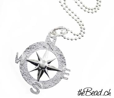 Schöner Silberschmuck mit einem grossen Kompass Anhänger, alles aus Silber gearbeitet. Der Kompass misst ca. 3 cm im Durchmesser, die Kettenlänge ist wählbar Material: 925 Sterling Silber
