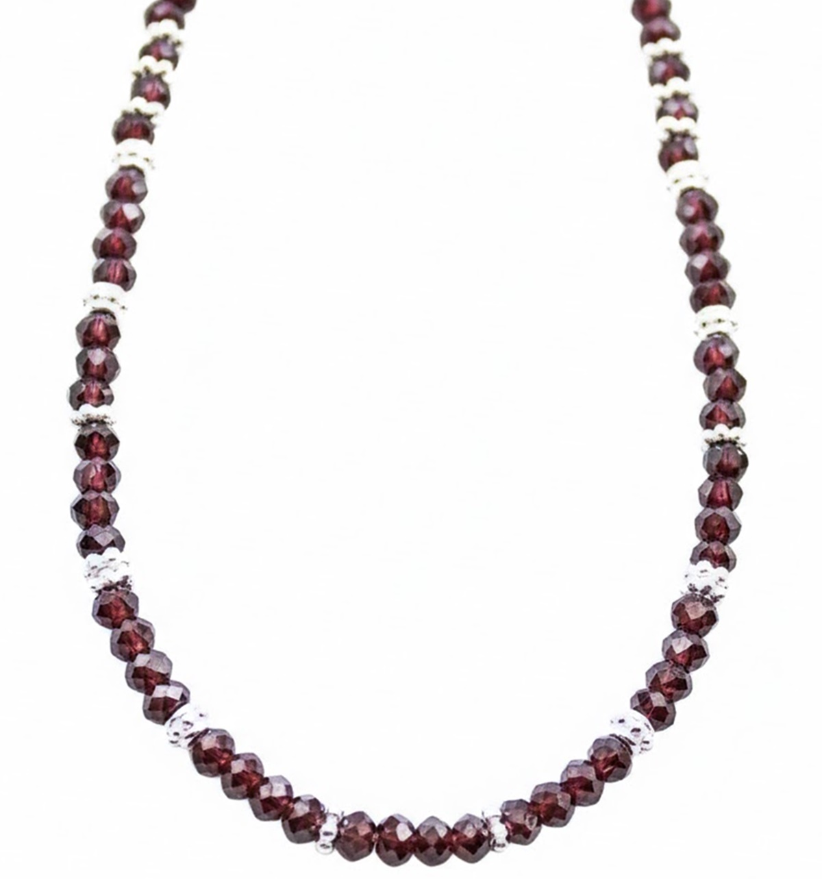 Sehr schöne Perlenkette aus facettierten Granat Perlen 4 mm, verziert mit vielen Silberperlen.