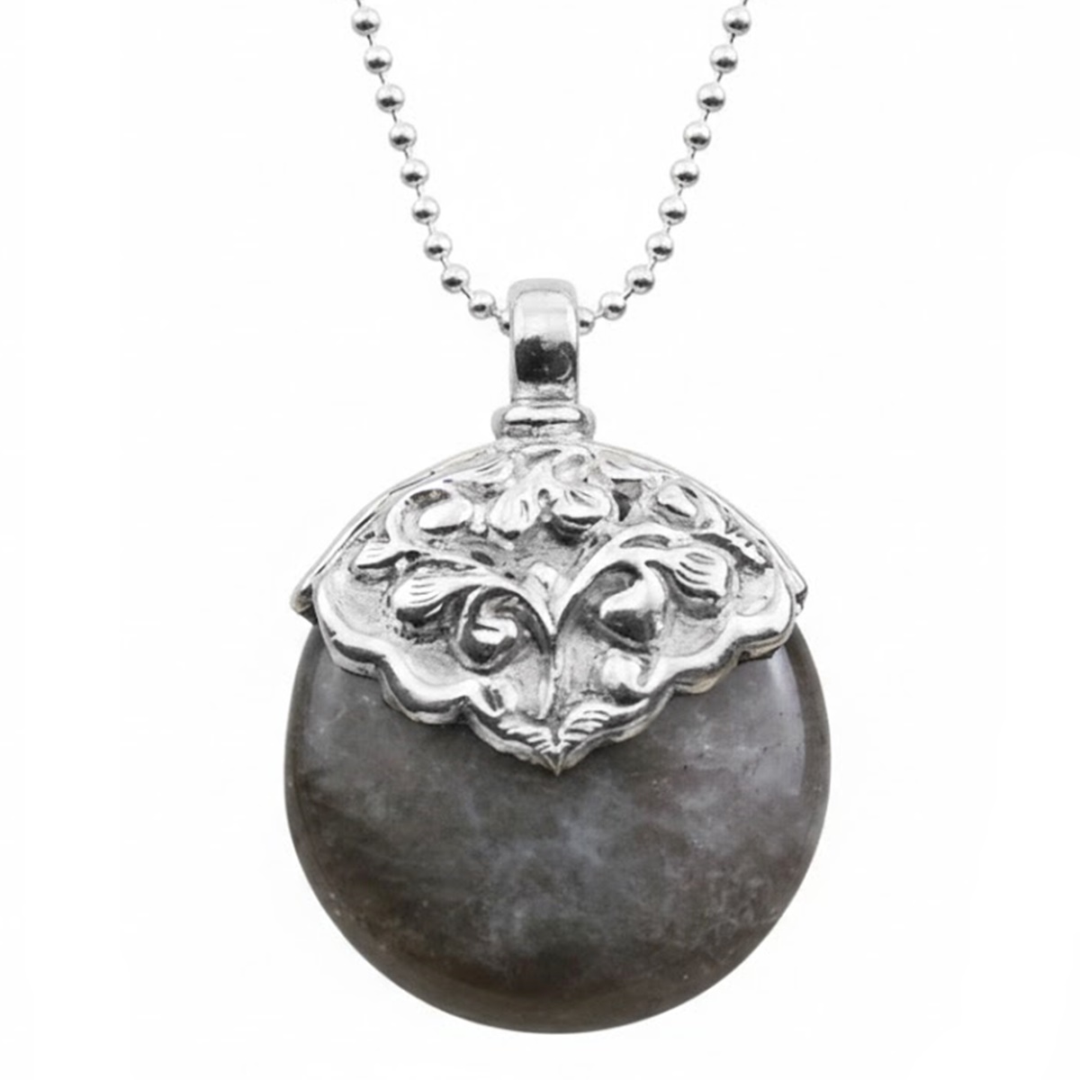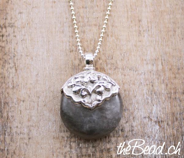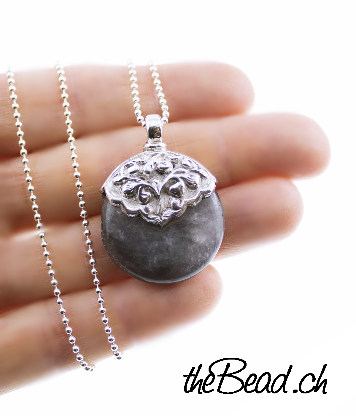Dieses Silber - Set besteht aus einer Silberhalskette und einem runden Grauquarz Anhänger.