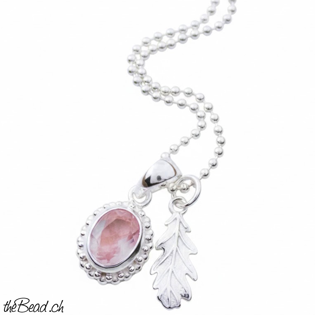 Silberkette ROSENQUARZ & Blatt Anhänger