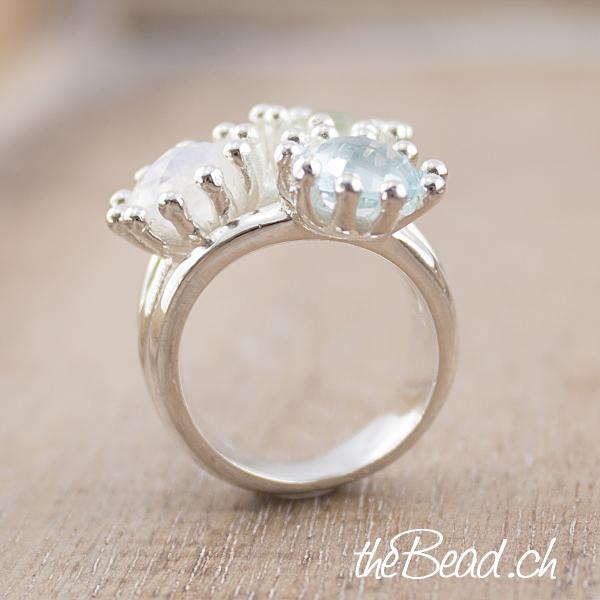 Silberring mit einem echten, facettierten Regenbogen MONDSTEIN, blauer TOPAS, grüner AMETHYST