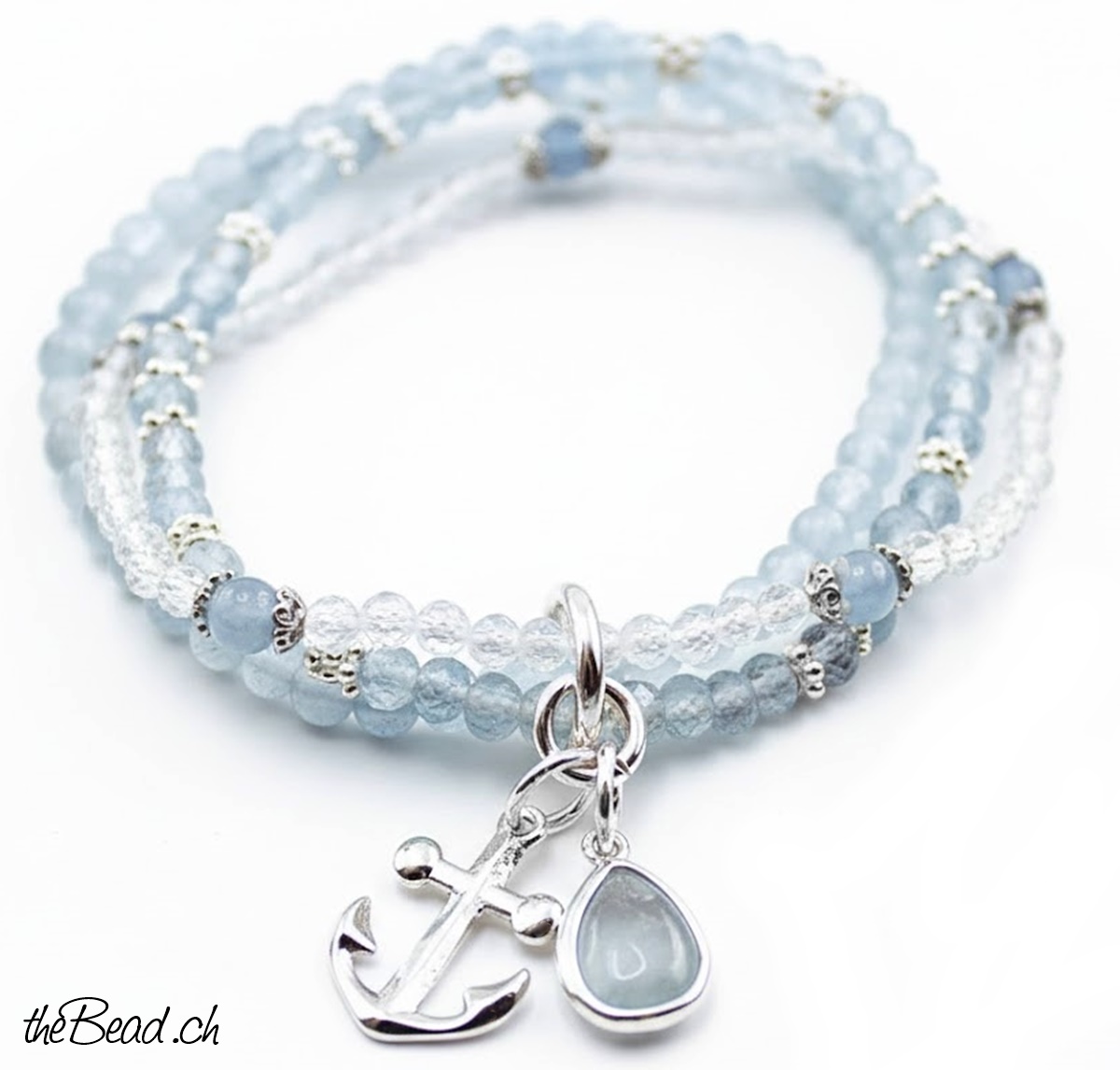 Am Armband baumeln ein Anker und Aquamarin Anhänger