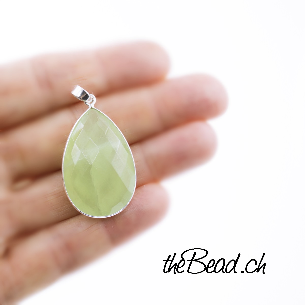 Dieser Anhänger besteht aus einem grossem facettierten (geschliffenem) Prehnit der in Silber eingefasst ist.