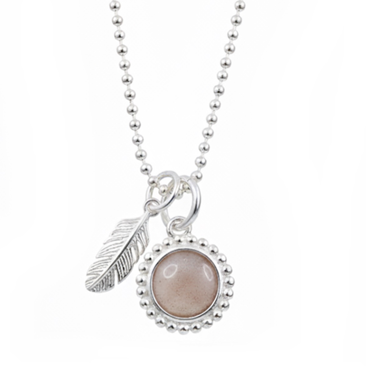 Dieses Silber Schmuckstück besteht aus einer Silberhalskette ( Länge zur Wahl ) und zwei süssen, kleinen Anhängern. Einem orangem Mondstein und einem Silber Feder Anhänger.