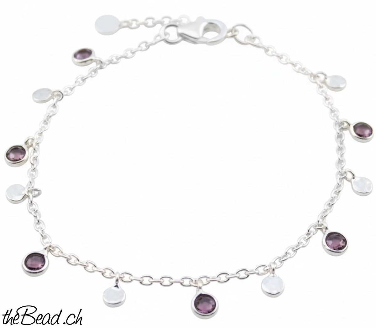 An diesem süssen Silberarmband hängen Granat- und Silberanhängerchen im Wechsel. Die kleinen Granat - Steinchen sind ebenfalls in Silber eingefasst.