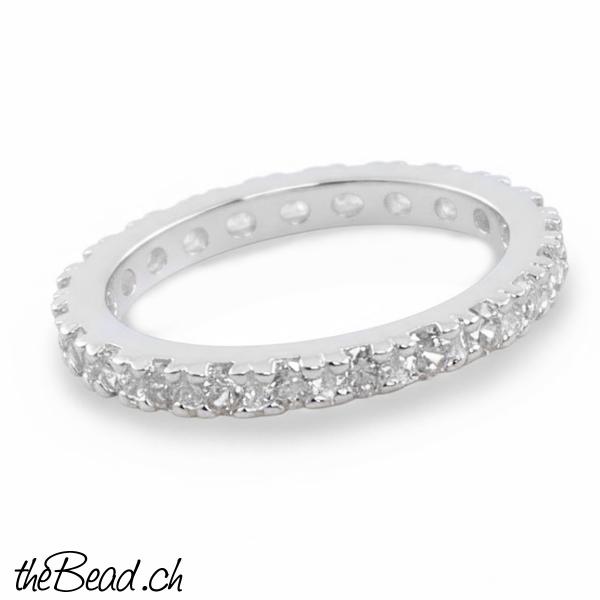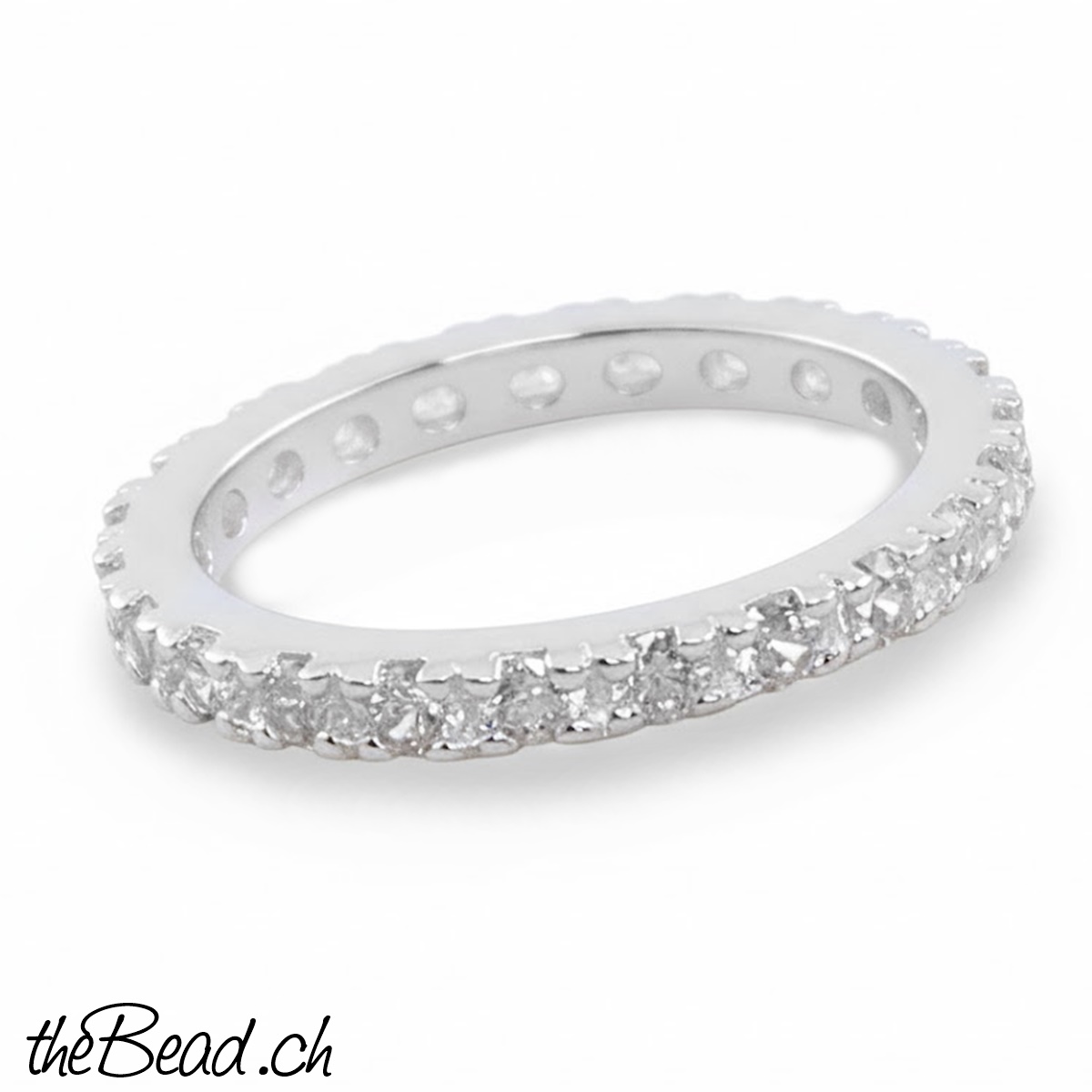 Der Silberring ist rundum mit Zirkonia bestückt und rundum gleich breit
