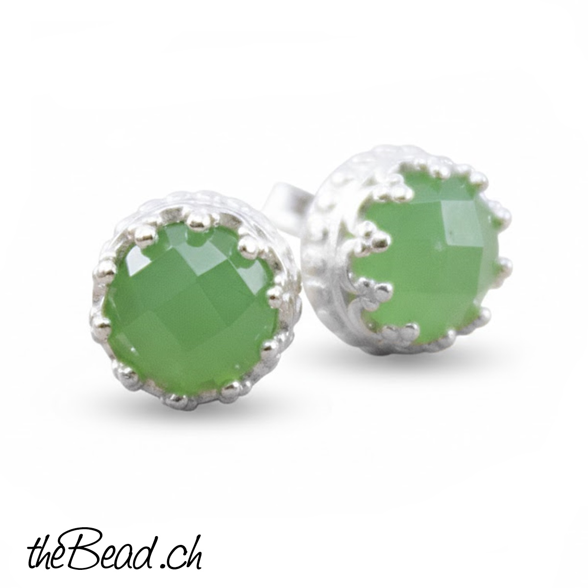 kleine CHRYSOPRAS Ohrstecker, in Pünktchenmuster eingefasst