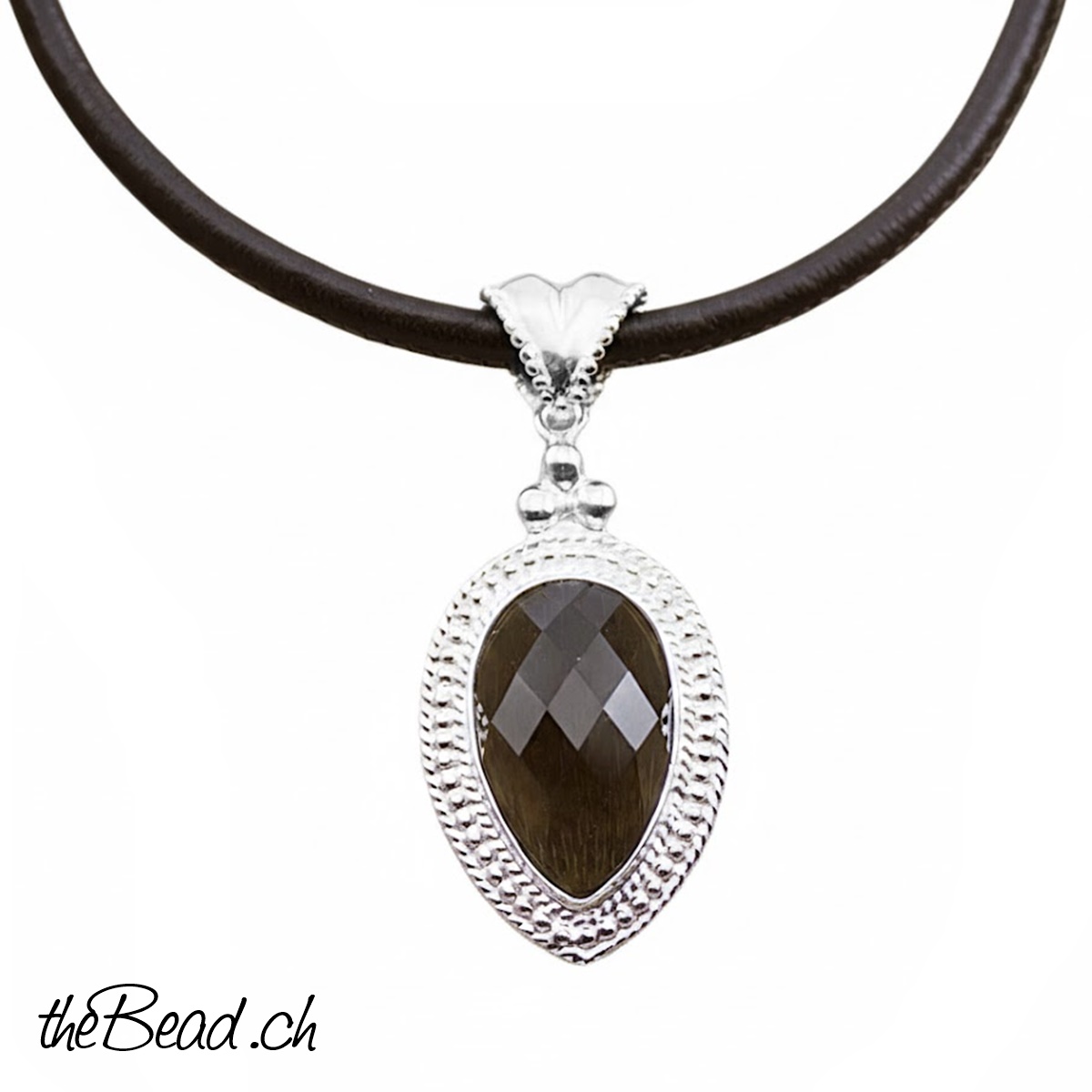 Diese Lederkette besteht aus einem weichen Nappaleder (Farbe nach Wahl) und einem sehr schönen, grossen Rauchquarz Anhänger. Der Rauchquarz ist in Silber eingefasst, auch der Verschluss der Lederkette besteht aus Silber.