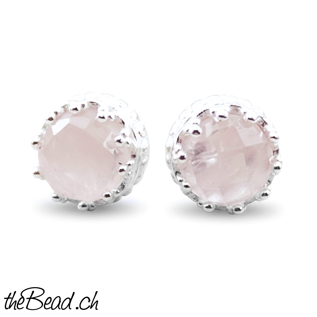 Die Rosenquarz Ohrstecker sind facettiert (geschliffen) und in kleinen KRÖNCHEN eingefasst.