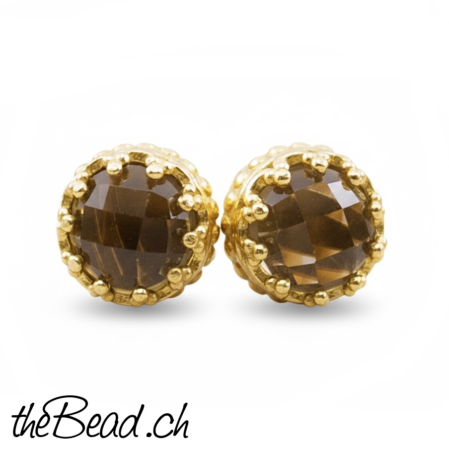 Die Rauchquarz Ohrstecker sind facettiert (geschliffen) und in kleinen KRÖNCHEN eingefasst.