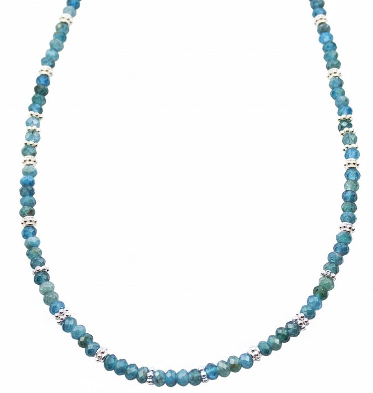 Sehr schöne Perlenkette aus facettierten Apatit Perlen 4 mm, verziert mit vielen Silberperlen.