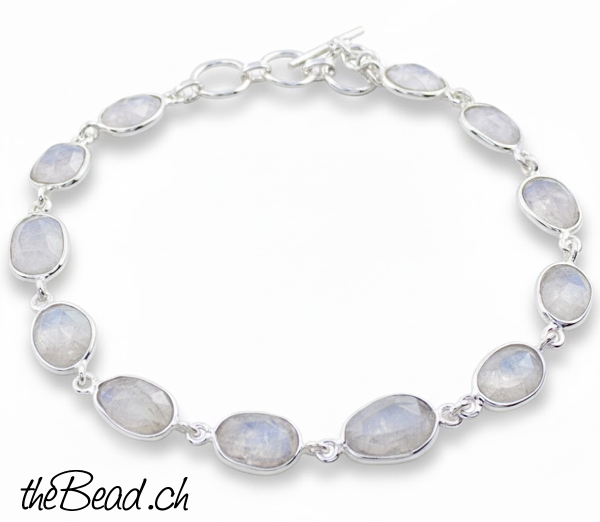 Der Regenbogen Mondstein ist in Silber eingefasst, wunderbarer Armschmuck und auch eine schöne Geschenkidee!