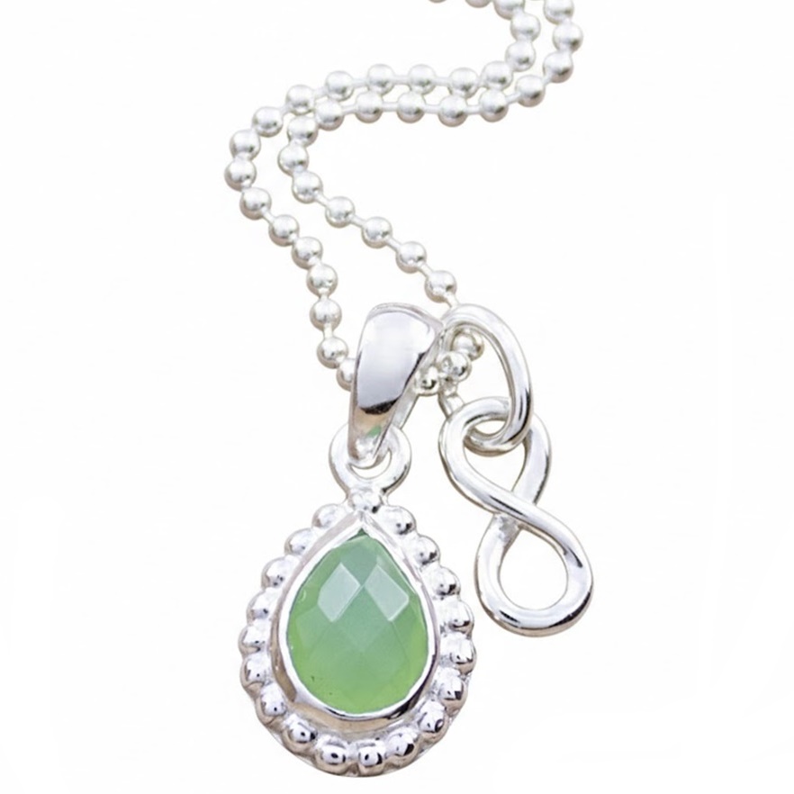 Süsser Silberschmuck - Silberhalskette mit einem Tropfen Chrysopras Anhänger, der Chrysopras Stein ist facettiert / geschliffen und funkelt wunderbar, der kleine INFINITY Anhänger gehört natürlich auch mit dazu. Die Kettenlänge ist wählbar