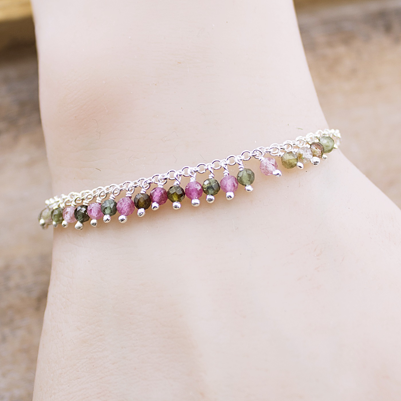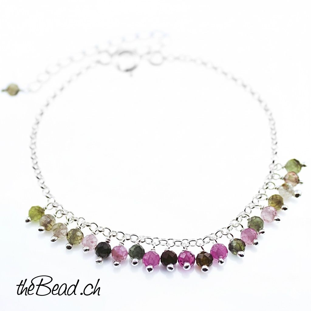 Süsses Silberarmband mit kleinen, bunten Turmalin Anhängerchen. Armbandlänge: 15.5 cm plus 5 cm Verlängerungskettchen Material: Silber 925 Sterling, Turmalin