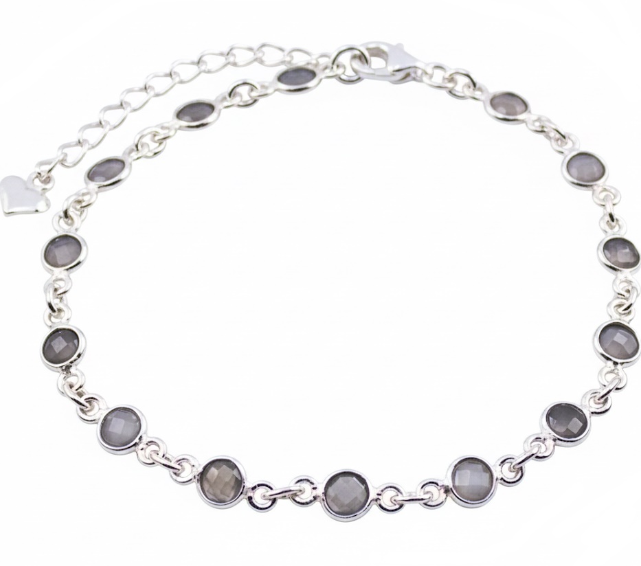 Das Armband besteht aus grauen Mondsteinen die in Silber eingefasst sind, es hat eine Länge von 17 cm plus 4 cm Verlängerungskettchen